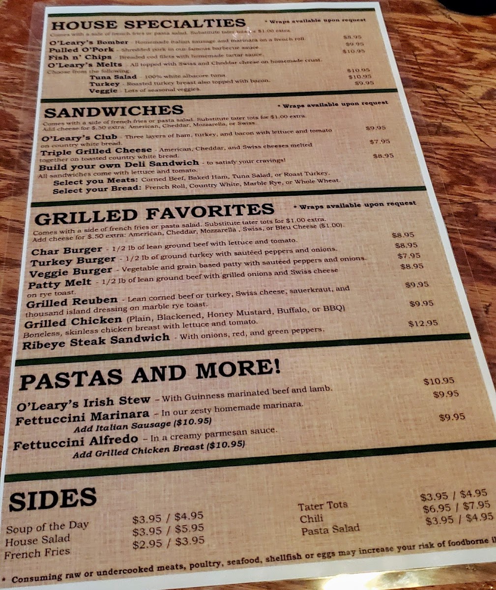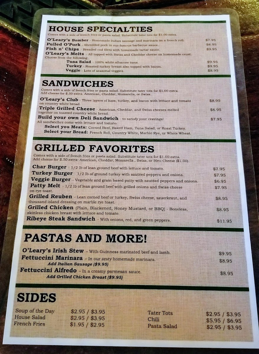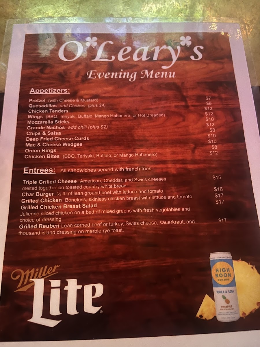O’Leary’s Public House offers a straightforward, comforting menu that perfectly matches its lively yet relaxed Irish pub atmosphere. Whether you’re settling in for a burger and fries during a game or sharing a plate of loaded nachos with friends, the menu features a range of casual bites designed for easy, satisfying moments.